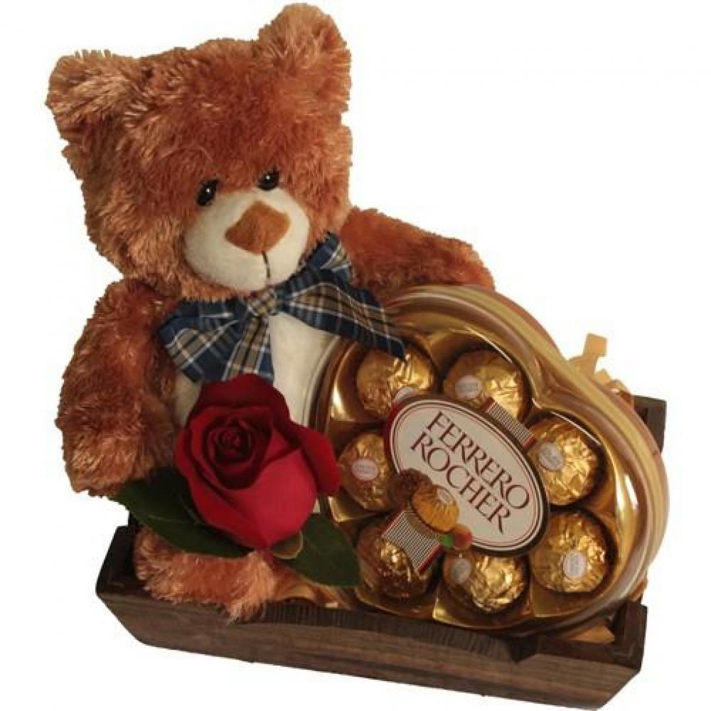 Cesta de Presente Caixa Romântica Ursinho e Flores